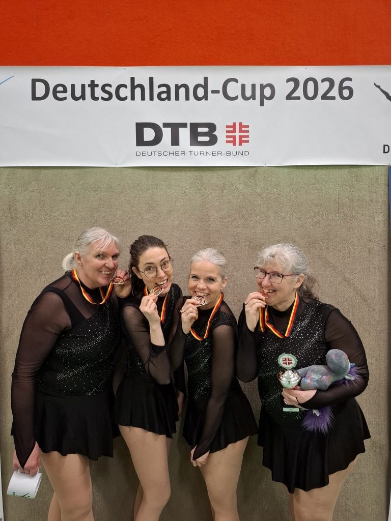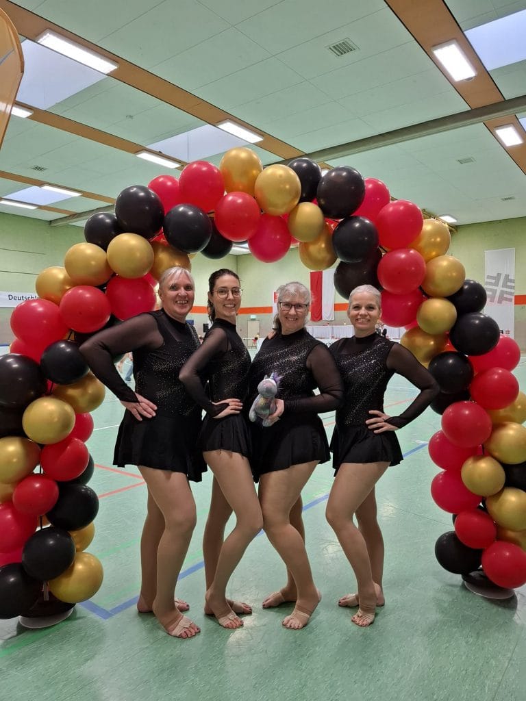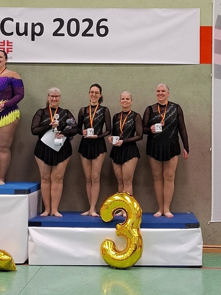 Aber da war ja auch noch die Siegerehrung dazwischen und die bange Frage aller Mannschaften der Kategorie 25+ wie man am besten auf die sehr hohen Podeste hinaufkommt. „Man kann fast von Glück sprechen, dass wir nur auf den niedrigsten Podestplatz mussten“, bemerkte Ina frohgemut über den 3. Platz. Auch Doris war mit ihrem ersten Wettkampf seit über 30 Jahren sehr zufrieden und zwischen Tanja und Charlotte entspannte sich auf der Heimfahrt noch eine längere Diskussion, ob man im nächsten Jahr am besten mit dem Gerät Reifen oder Ball starten sollte.