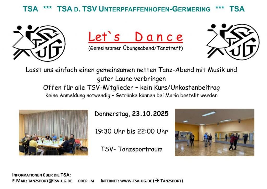 die Tanzsportabteilung lädt am Donnerstag, den 23.10. von 19:30 – 21:30 zu einem netten Tanzabend im Tanzsportraum des TSV UG ein. Es ist keine Anmeldung notwendig. Getränke können bei Maria unserer Sportwirtin bestellt werden. Lasst uns also einfach gemeinsam einen netten Tanzabend mit Musik und guter Laune verbringen.Kein Kurs oder Unkostenbeitrag!