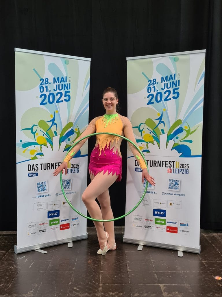 Neben den zahlreichen Gruppengymnastinnen des TSV UG gab es in Leipzig auch fünf „Einzelkämpferinnen“, die den sogenannten Wahlwettkampf bestritten. Dabei wählt man drei Übungen aus verschiedenen (turnerischen) Sportarten aus – z.B. Gerätturnen, Schwimmen, Leichtathletik, Rope Skipping und vielem mehr. Wir fünf wählten alle drei Übungen aus dem Bereich Rhythmische Gymnastik mit jeweils verschiedenen Handgeräten und bestritten somit einen sogenannten Fachwettkampf.